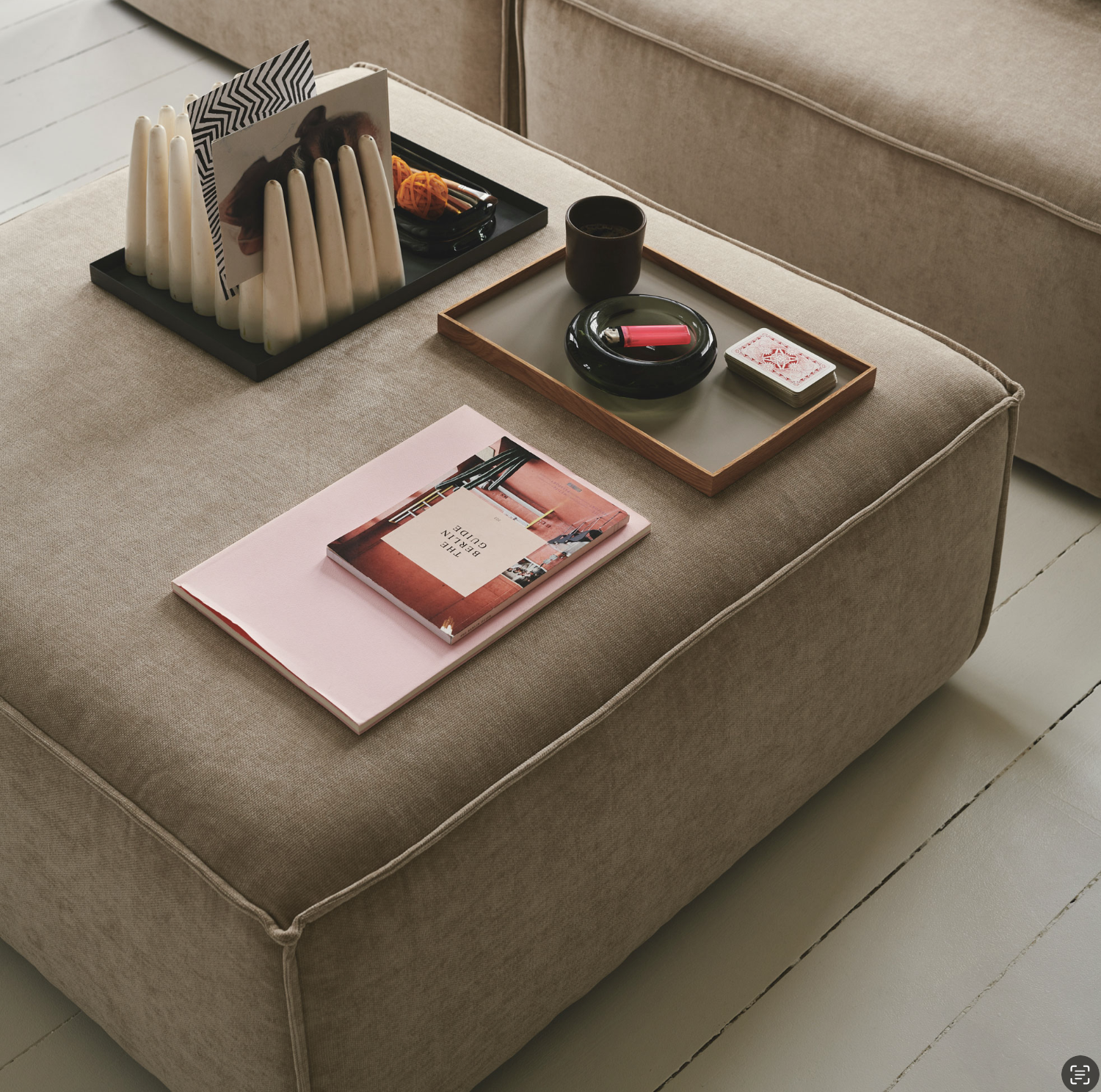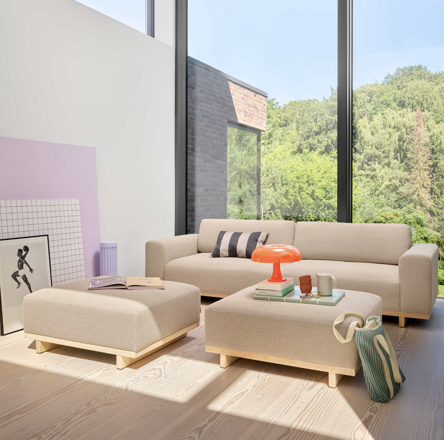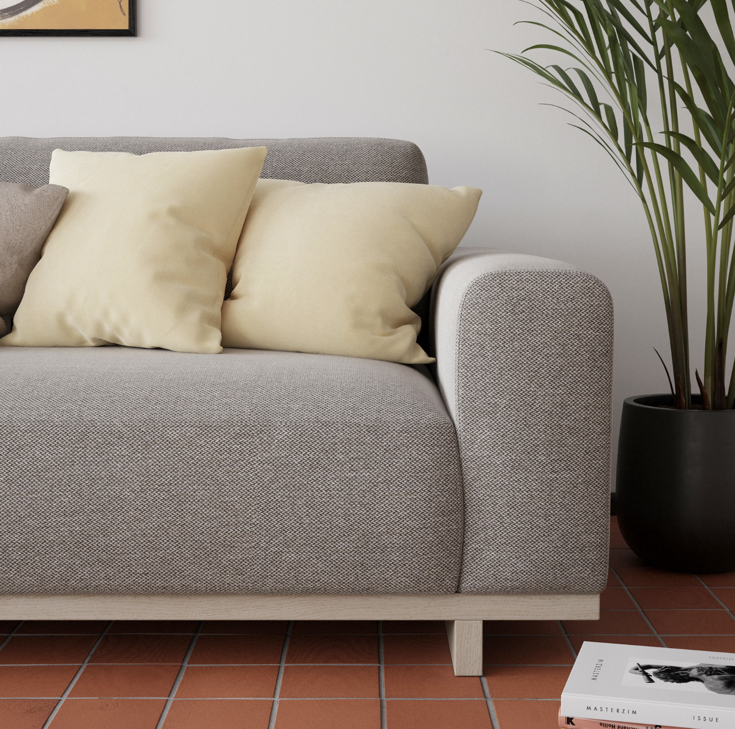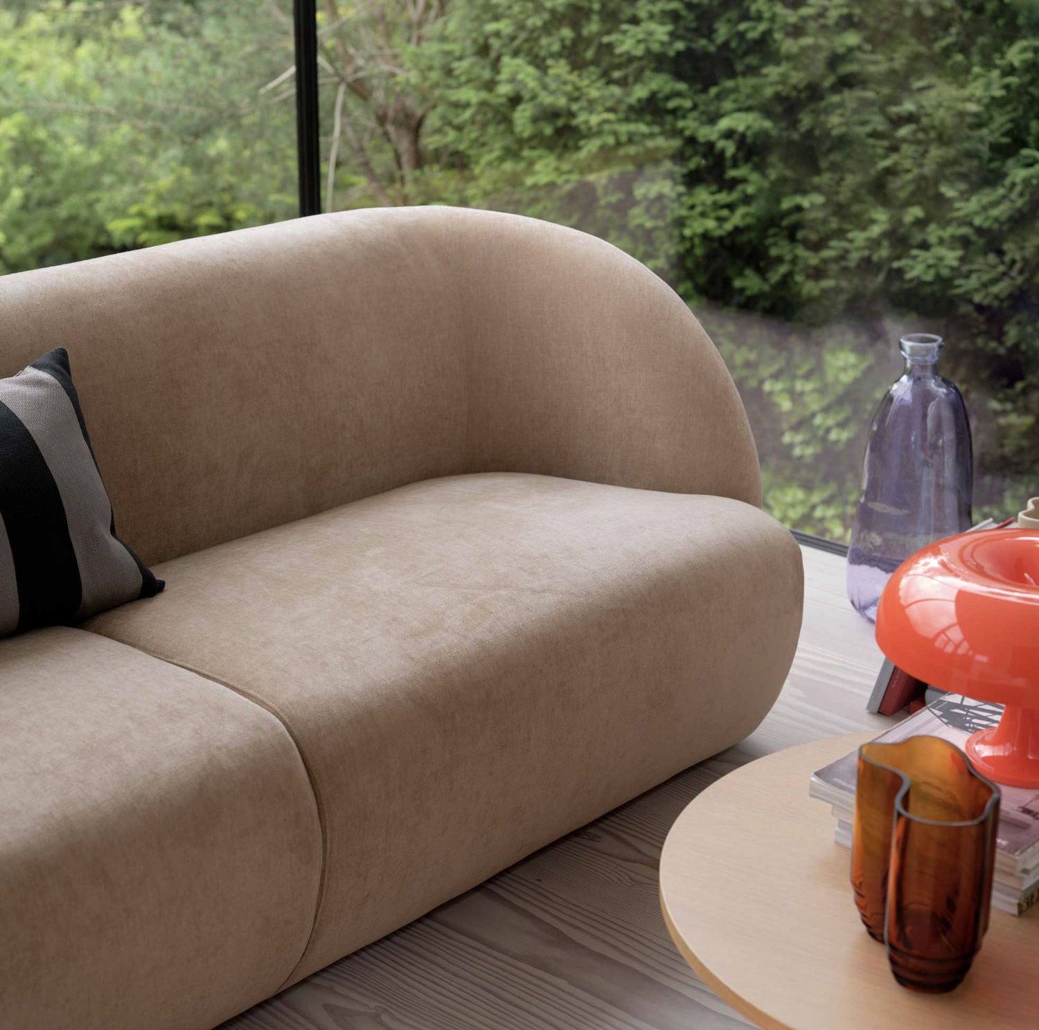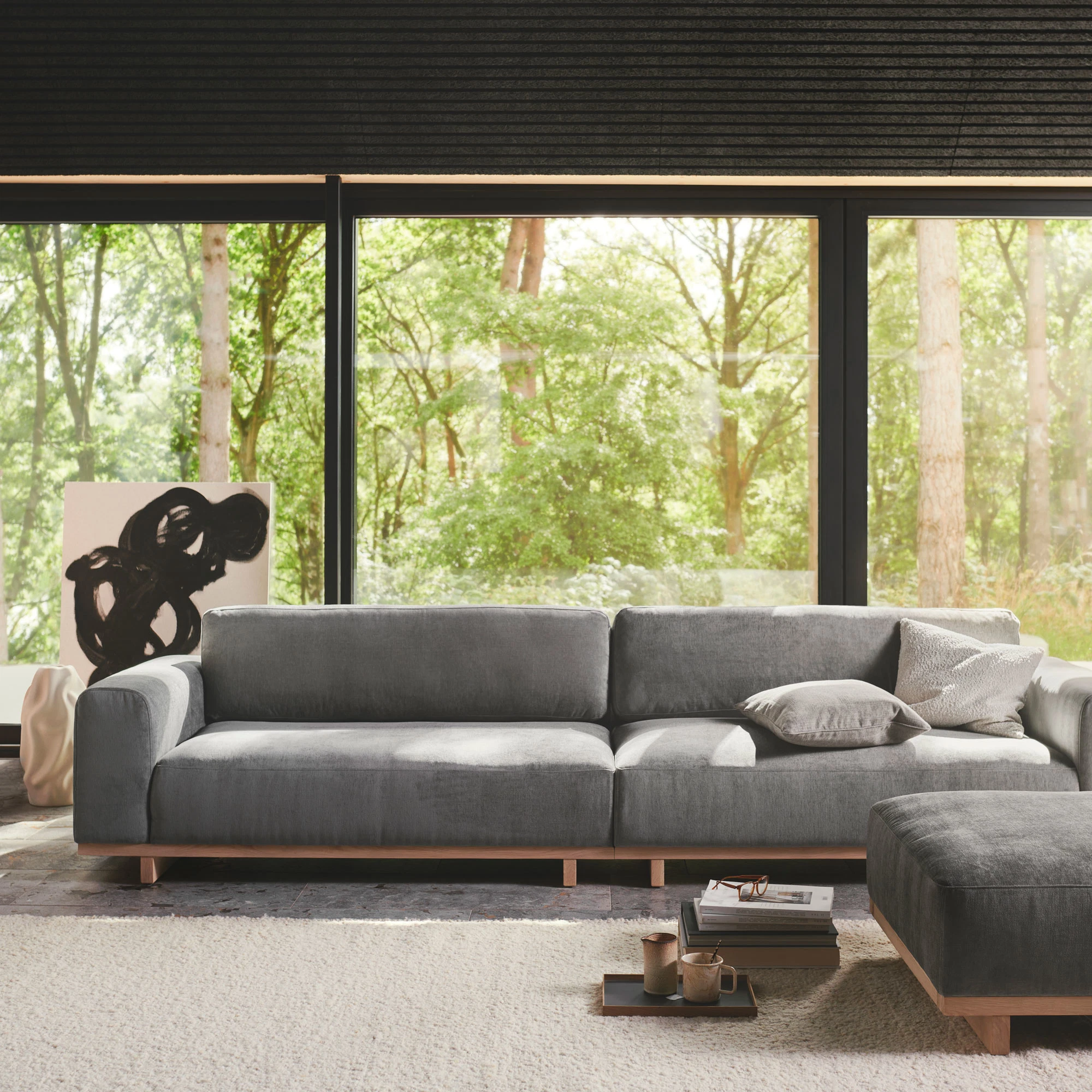 • Materialmix: Ergänzend zum Sofa bieten Holztische, Naturtextilien und minimalistische Lampen eine harmonische Umgebung.