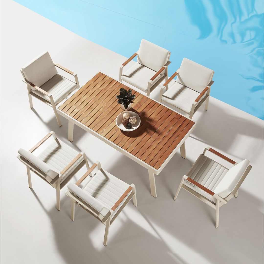 Der Esstisch ist das Herzstück jeder Outdoor-Küche. Hier treffen sich alle, um gemeinsam zu essen, zu lachen und den Moment zu genießen. Wichtig ist, dass dein Tisch nicht nur optisch überzeugt, sondern auch den Herausforderungen des Wetters standhält. Wetterbeständige Materialien wie pulverbeschichtetes Metall, massives Teakholz oder Glas sorgen für Langlebigkeit und eine edle Optik.