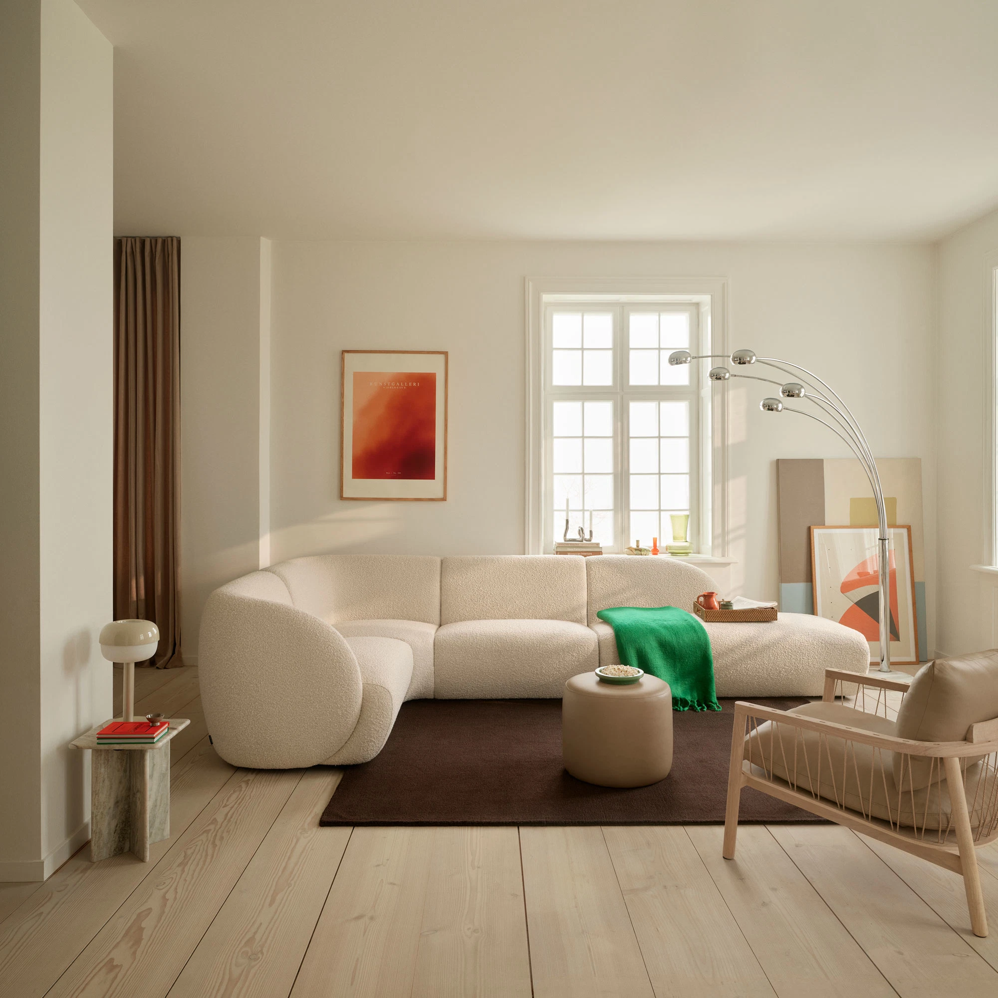 • Materialmix: Ergänzend zum Sofa bieten Holztische, Naturtextilien und minimalistische Lampen eine harmonische Umgebung.