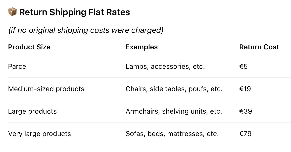 For example, if you buy a lamp for €49 and pay €5 for delivery, we will refund you €49 after we have received the return. If your order incurred no delivery costs, the return cost depends on the size of the product you wish to send back.